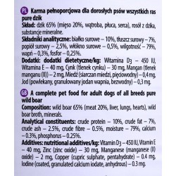 dzik 65% (mięso 20%, wątroba, płuca, serca), rosół z dzika, substancje mineralne
